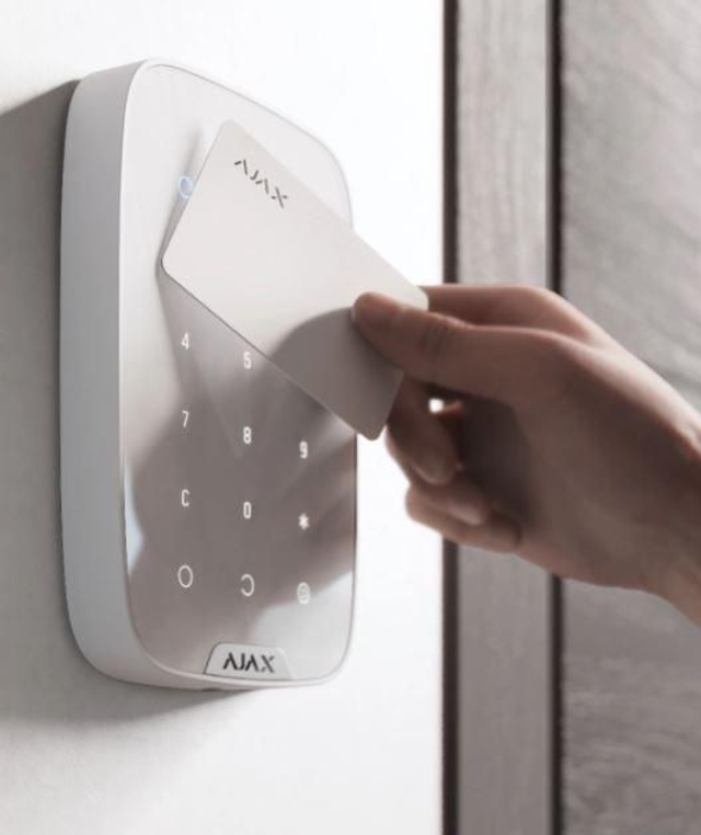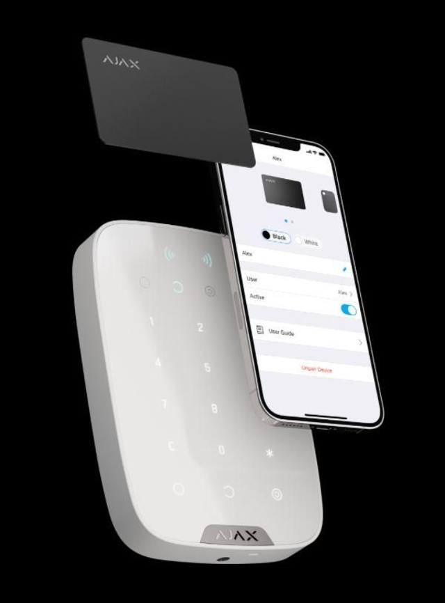 Sans fil. Carte sans contact. Il suffit de placer le PASS devant le lecteur du clavier pour désarmer le système. Gestion des noms et autorisations d'accès pour chaque carte via l'application.