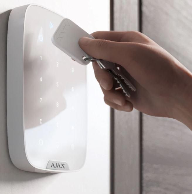 Sans fil. Il s'agit d'un porte-clés sans contact. Il suffit de la présenter devant le clavier pour désarmer le dispositif.